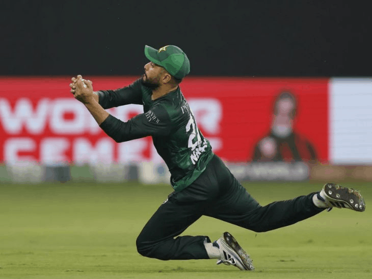 4. मोहम्मद नवाज ने बेहतरीन रनिंग कैच पकड़ा UAE की बैटिंग में पाकिस्तान के मोहम्मद नवाज ने बेहतरीन रनिंग कैच पकड़ा। पांचवें ओवर की तीसरी बॉल अबरार अहमद ने ऑफ स्टंप के बाहर कैरम फेंकी। मोहम्मद वसीम बड़ा शॉट खेलने गए, लेकिन गेंद कवर्स की दिशा में खड़ी हो गई। मोहम्मद नवाज पॉइंट पोजिशन से बाउंड्री की ओर दौड़े, उन्होंने डाइव लगाकर कैच पकड़ा और वसीम को पवेलियन भेज दिया। वसीम 14 रन बनाकर आउट हुए।