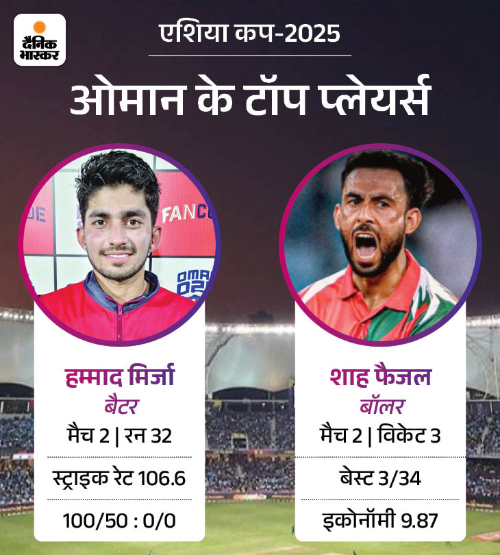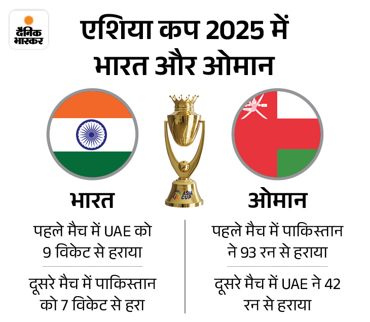 भारतीय टीम पहले ही लगातार दो जीत के साथ सुपर-4 के लिए क्वालिफाई कर चुकी है। आज के मैच में जीत के साथ भारत के पास नंबर-1 पर रहते हुए ग्रुप स्टेज खत्म करने का मौका होगा। वहीं, ओमान की टीम लगातार दो हार के साथ रेस से बाहर हो चुकी है।