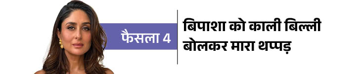 जब ये बात बबीता को पता चली तो वो तान्या पर चिल्लाने लगीं। जवाब में तान्या ने भी पलटकर जवाब दे दिया। करीना से मां की बेइज्जती बर्दाश्त नहीं हुई और उन्होंने तान्या से झगड़ा शुरू कर दिया। बहस के दौरान करीना ने बिपाशा को काली बिल्ली कहा और उन्हें थप्पड़ मार दिया। जब बॉबी देओल ने बीच-बचाव किया तो करीना उन पर भी बरस पड़ीं।