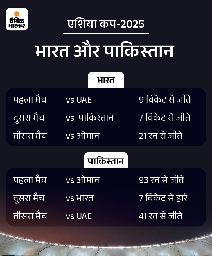एशिया कप में जीत की हैट्रिक बना चुकी भारतीय टीम आज सुपर-4 राउंड में पहला मुकाबला खेलने उतरेगी। सामने चिर प्रतिद्वंद्वी पाकिस्तान है। ग्रुप स्टेज में भारत ने पाकिस्तान को एकतरफा अंदाज में 7 विकेट से हराया था। मुकाबला दुबई इंटरनेशनल स्टेडियम में रात 8 बजे से खेला जाएगा। टॉस शाम 7:30 पर होगा।