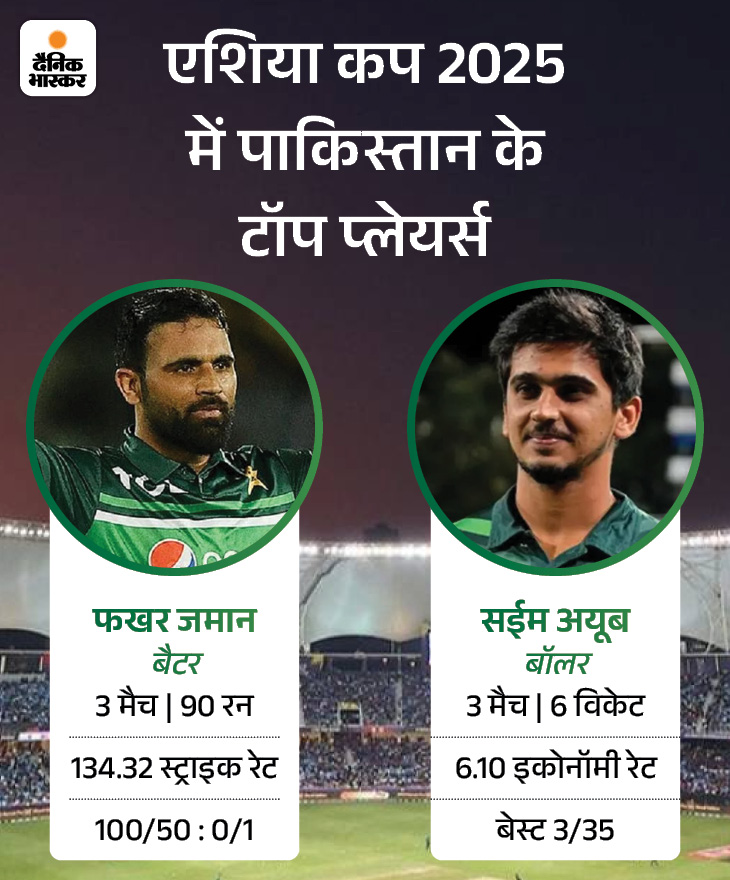 पाकिस्तान की पॉसिबल प्लेइंग-11 सईम अयूब, साहिबजादा फरहान, फखर जमान, सलमान अली आगा (कप्तान), हसन नवाज, खुशदिल शाह, मोहम्मद हारिस, मोहम्मद नवाज, शाहीन शाह अफरीदी, हारिस रउफ और अबरार अहमद