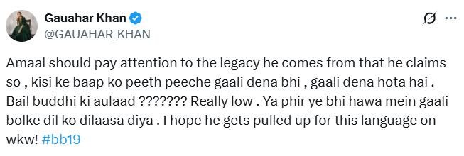 दरअसल, हाल ही में अमाल मलिक का घर में झगड़ा हुआ था, जिसमें उन्होंने अपने को-कंटेस्टेंट को बैल बुद्धि की औलाद कहा था। इस पर भड़कते हुए गौहर खान ने ऑफिशियल सोशल मीडिया अकाउंट से लिखा है, अमाल को उस विरासत पर ध्यान देना चाहिए, जिससे वह होने का दावा करता है। किसी के बाप को पीठ पीछे गाली देना भी गाली देना ही होता है। “बैल बुद्धि की औलाद”????? ये तो वाकई बहुत नीचा स्तर है। या फिर ये भी बस हवा में गाली बोलकर दिल को दिलासा दे दिया। मुझे उम्मीद है कि वीकेंड का वार पर उसे इस भाषा के लिए फटकार लगेगी।