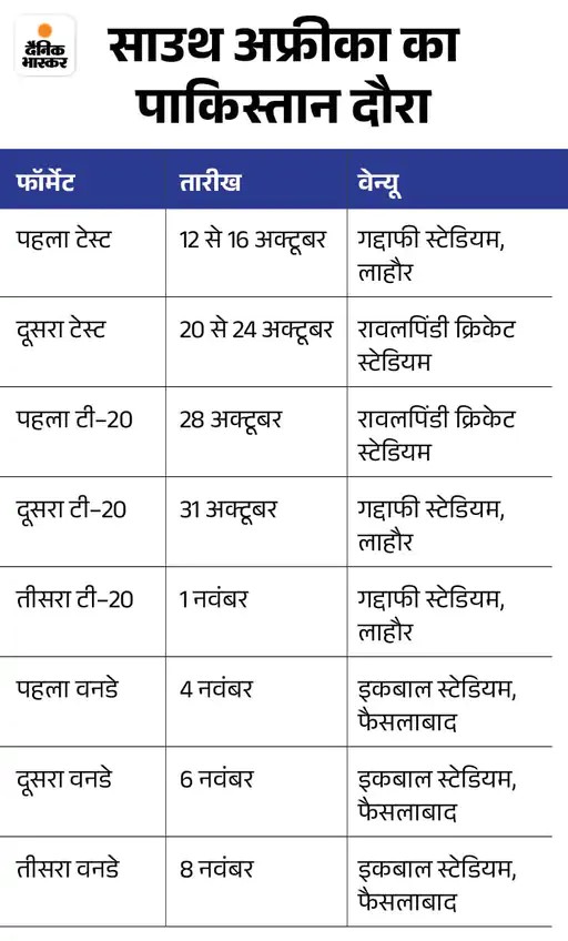 अक्टूबर में पाक दौरे पर जाएगी साउथ अफ्रीकी टीम साउथ अफ्रीका को अक्टूबर-नवंबर में पाकिस्तान के दौरे पर जाना है। वहां दोनों टीमों के बीच दो टेस्ट के अलावा तीन वनडे और इतने ही टी-20 इंटरनेशनल मैच खेले जाएंगे। 12 अक्टूबर से टेस्ट सीरीज की शुरुआत होगी। इसके बाद 28 अक्टूबर से 1 नवंबर तक तीन टी-20 इंटरनेशनल मैच होंगे। 4 से 8 नवंबर के बीच वनडे सीरीज खेली जाएगी। पिछले साल टी-20 वर्ल्ड कप में डिकॉक ने साउथ अफ्रीका के लिए अपना आखिरी इंटरनेशनल मैच खेला था।