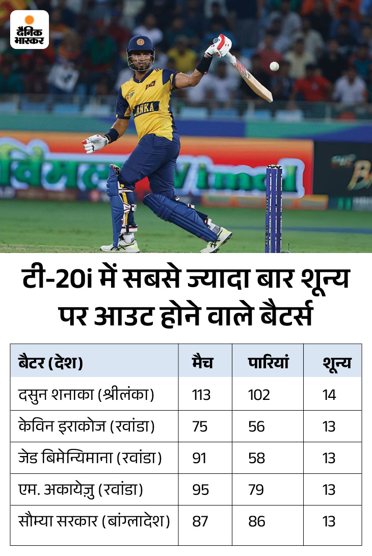 - श्रीलंकाई बैटर दसुन शनाका टी-20 इंटरनेशनल में सबसे ज्यादा 14 बार शून्य पर आउट होने वाले बैटर बन गए हैं। उन्होंने रवांडा के केविन इराकोज (13 बार) का रिकॉर्ड तोड़ा।