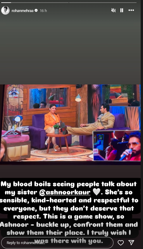 अब इन्हीं सब कमेंट्स पर अब रोहन मेहरा ने रिएक्शन दिया है। उन्होंने कहा, शो का एक क्लिप शेयर किया और लिखा, मेरे खून में आग सी उठ जाती है जब लोग मेरी बहन अश्नूर के बारे में ऐसी बातें करते हैं। वह बहुत समझदार, दयालु और सभी के प्रति सम्मानित हैं। लेकिन वे लोग उस सम्मान के हकदार नहीं हैं। यह एक गेम शो है, तो अश्नूर हिम्मत करो, उनका सामना करो और उन्हें उनकी जगह दिखाओ। काश मैं तुम्हारे साथ वहां होता।