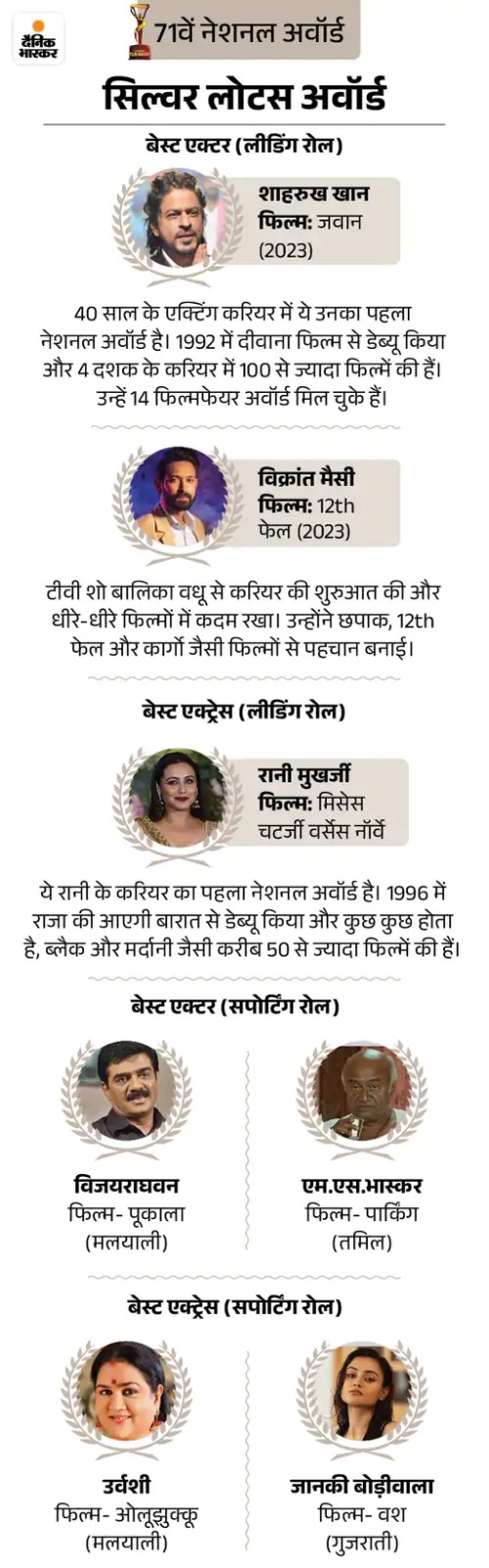 वहीं, रानी मुखर्जी को फिल्म मिसेज चटर्जी वर्सेस नॉर्वे के लिए अवॉर्ड मिला। इस मौके पर वह काफी भावुक नजर आईं। उन्होंने कहा कि यह पुरस्कार वह अपने दिवंगत पिता को समर्पित करती हैं, जिन्होंने हमेशा इस पल का सपना देखा था।