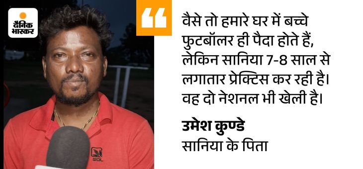 सानिया बोली- बहन से मिली प्रेरणा सानिया अपनी फुटबॉल जर्नी के बारे में बताती है- पिछले 6 साल से प्रैक्टिस कर रही हूं। जब मैं छोटी थी, तब घर के पीछे एक ग्राउंड पर कुछ भैया लोग फुटबॉल खेलते थे। मैं भी उन्हीं के साथ खेलने लगी। वो मुझे छोटा समझकर भगा देते थे, लेकिन मैं उसके बाद भी हार नहीं मानती थी। कुछ सालों बाद भैया लोगों की शादी हो गई और उन्होंने खेलना बंद कर दिया।