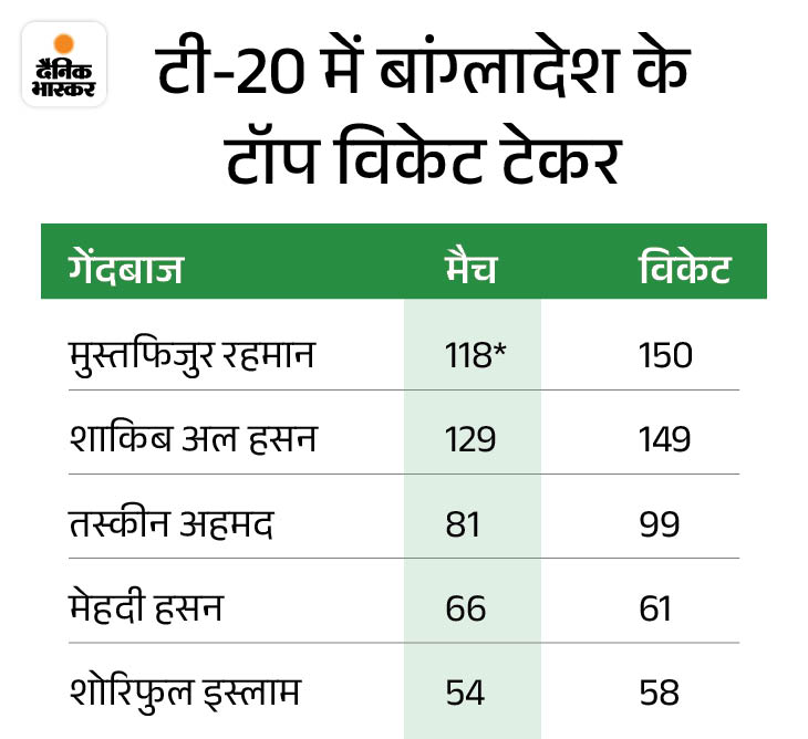 1. मुस्तफिजुर बांग्लादेश के टॉप टी-20 विकेट टेकर बांग्लादेश के लेफ्ट आर्म पेसर मुस्तफिजुर रहमान ने भारत के खिलाफ 33 रन देकर 1 विकेट लिया। पारी में इकलौते विकेट के साथ उनके टी-20 इंटरनेशनल में 150 विकेट भी पूरे हो गए। इसी के साथ वे टी-20 में बांग्लादेश के टॉप विकेट टेकर भी बन गए। मुस्तफिजुर ने स्पिनर शाकिब अल हसन को पीछे छोड़ा। जिनके नाम 149 विकेट थे।