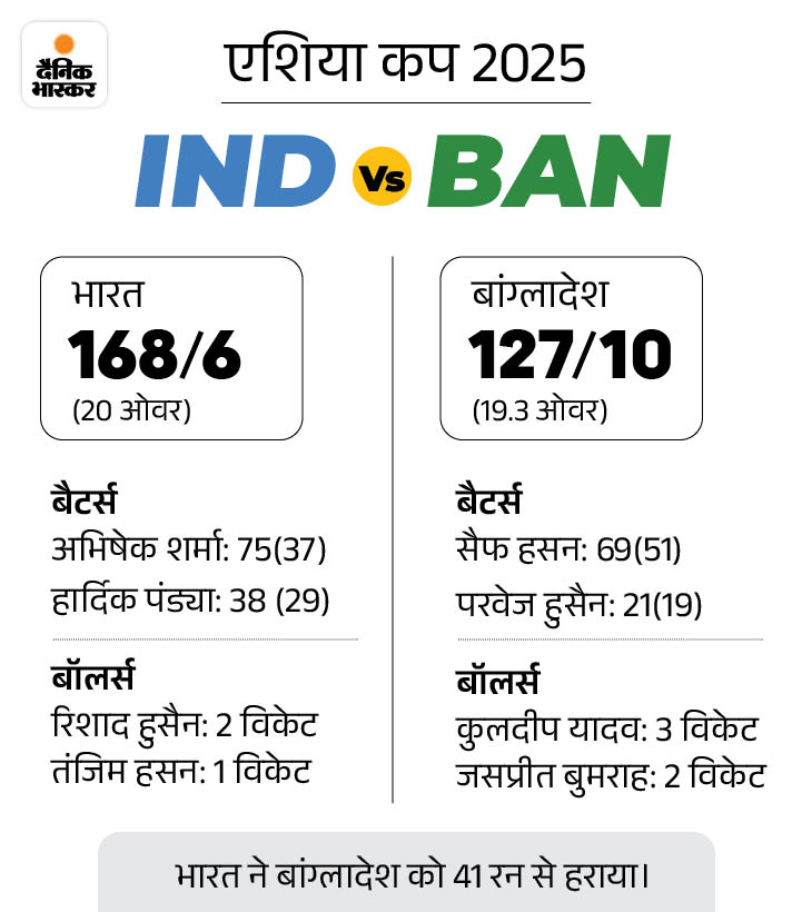 भारत ने बुधवार को बांग्लादेश के खिलाफ 41 रन की जीत के साथ एशिया कप के फाइनल में एंट्री कर ली। तीसरी बार टी-20 फॉर्मेट में हो रहे एशिया कप के फाइनल में भारत ने दूसरी बार जगह बनाई। लेफ्ट आर्म पेसर मुस्तफिजुर रहमान बांग्लादेश के टॉप विकेट टेकर बन गए।