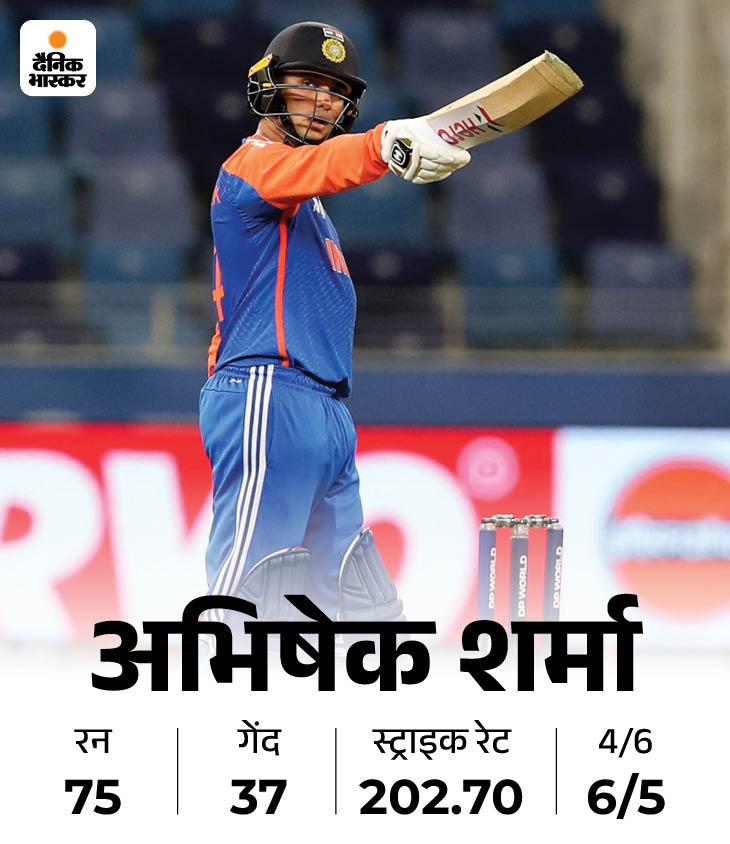 - अभिषेक हर पारी में औसतन 2.76 छक्के लगाते हैं। 50 से ज्यादा छक्के लगाने वाले प्लेयर्स में अभिषेक दूसरे नंबर पर हैं। करणबीर सिंह औसतन 3.14 छक्के लगाकर टॉप पर हैं। उन्होंने 36 पारियों में 113 सिक्स लगाए हैं। फुल मेंबर देशों में एविन लुईस (2.13) दूसरे नंबर पर हैं।