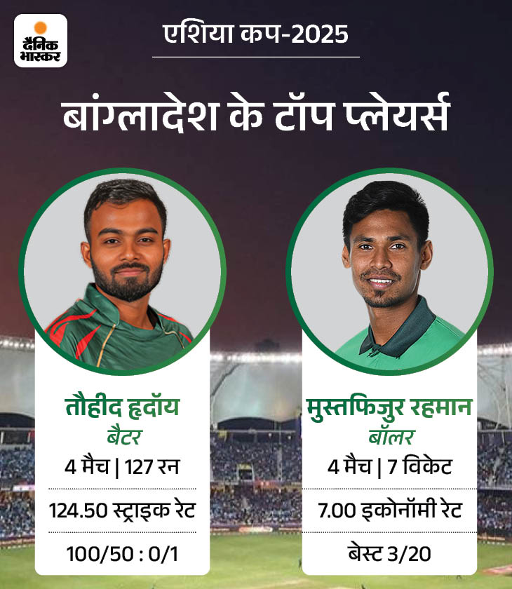 बांग्लादेश की ओर से मुस्तफिजुर अच्छा प्रदर्शन कर रहे दूसरी तरफ, बांग्लादेश टीम ने भी टूर्नामेंट में अच्छा प्रदर्शन किया है। मुस्तफिजुर रहमान अच्छी गेंदबाजी कर रहे हैं। लेकिन, टीम के ऑलराउंडर महेदी हसन खराब फार्म से जूझ रहे हैं। टीम की बल्लेबाजी में भी स्थिरता की कमी है। टॉप ऑर्डर बैटर तौहीद हृदॉय ने सबसे ज्यादा 127 रन बनाए। मुस्तफिजुर रहमान ने सबसे ज्यादा विकेट लिए हैं।