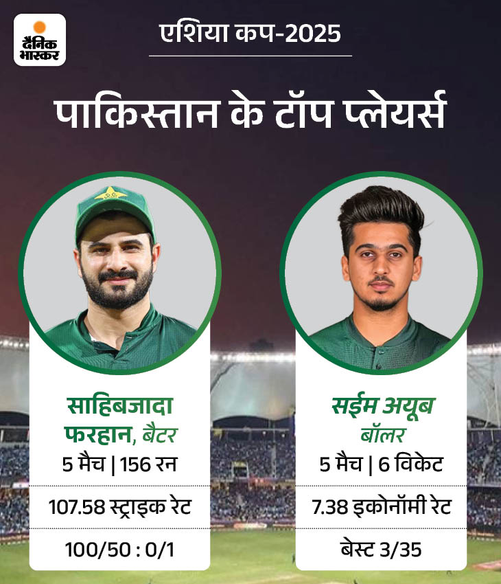 साहिबजादा ने पाक के लिए सबसे ज्यादा रन बनाए पाकिस्तान इस मैच में स्ट्रॉन्ग दिख रही है। टीम के तेज गेंदबाज शाहीन अफरीदी और हारिस रऊफ अच्छी गेंदबाजी कर रहे हैं। पिछले मैच में भी इन दोनों ने पांच विकेट लिए थे। इन दोनों के अलावा सईम अयूब ने भी अच्छी गेंदबाजी की है। टॉप ऑर्डर में साहिबजादा फरहान ने अच्छी बल्लेबाजी की है। साहिबजादा एशिया कप 2025 में टीम के टॉप स्कोरर हैं।