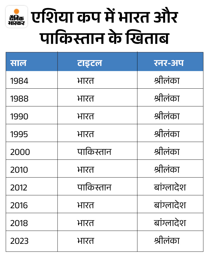 पाकिस्तान ने 15 एडिशन में 2 ही बार टाइटल जीता था। टीम ने 2000 में श्रीलंका और 2012 में बांग्लादेश को फाइनल हराकर खिताब जीता। टीम 2022, 2014 और 1986 में रनर-अप भी रही, लेकिन कभी भारत से खिताबी भिड़ंत नहीं कर पाई। 48 साल पुराने टूर्नामेंट में इस बार 8 टीमों ने हिस्सा लिया और पहली बार ही दोनों चीर-प्रतिद्वंद्वी टीमों ने एक साथ खिताबी मुकाबले में जगह बनाई है।