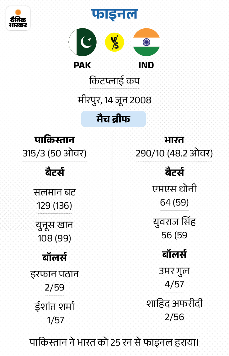 फाइनल-9: किटप्लाई कप में युनूस खान का शतक 14 जून 2008 को मीरपुर में किटप्लाई कप के फाइनल में दोनों टीमें भिड़ीं। पाकिस्तान ने पहले बैटिंग करते हुए महज 3 विकेट खोकर 315 रन बना दिए। युनूस खान ने 108 और सलमान बट ने 129 रन बना दिए। जवाब में भारत ने फाइट दिखाई, लेकिन टीम 290 रन ही बना सकी। एमएस धोनी और युवराज सिंह ने फिफ्टी लगाई थी।