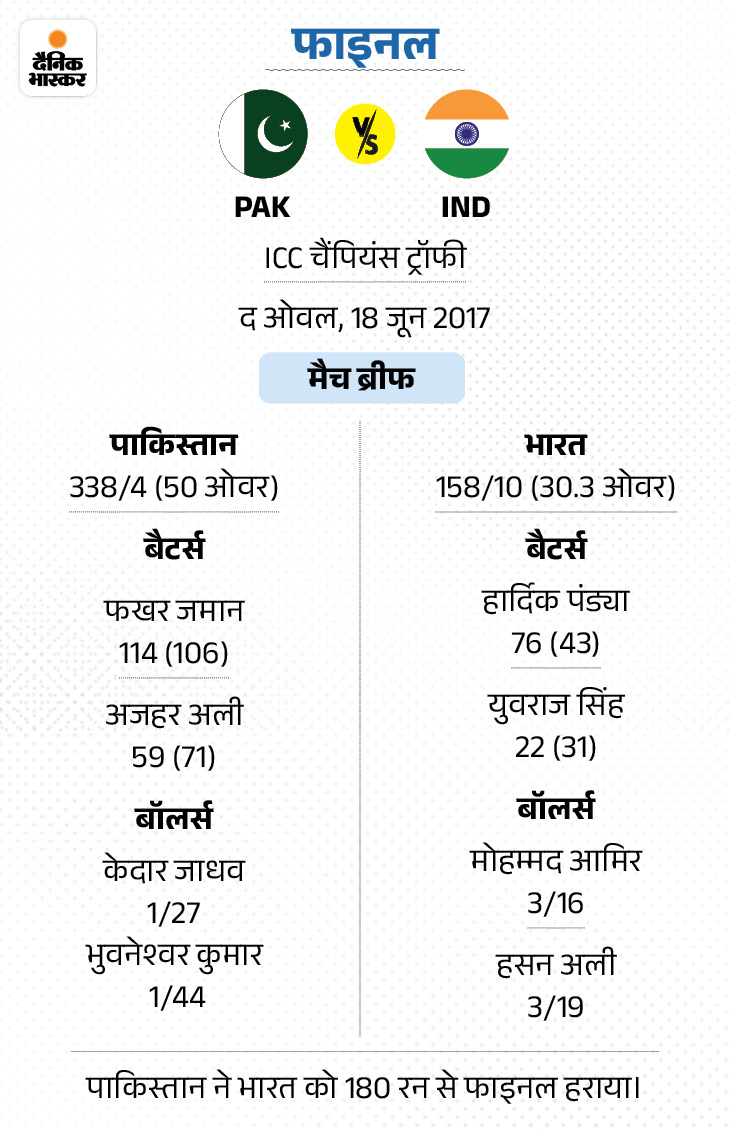 लंदन में भारत ने टॉस जीतकर बॉलिंग चुन ली। पाकिस्तान से फखर जमान ने शतक लगाया, टीम ने 4 विकेट खोकर 338 रन बना दिए। जवाब में टीम इंडिया ने पावरप्ले में ही रोहित शर्मा, विराट कोहली और शिखर धवन के विकेट गंवा दिए। हार्दिक पंड्या ने 76 रन बनाए, लेकिन टीम 158 रन पर ही सिमट गई। फखर प्लेयर ऑफ द मैच रहे। वहीं 13 विकेट लेने वाले हसन अली प्लेयर ऑफ द टूर्नामेंट चुने गए।