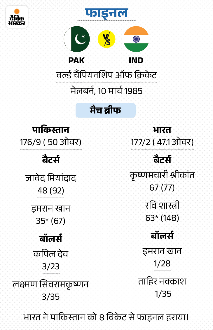 फाइनल-1: भारत ने वर्ल्ड चैंपियनशिप जीती 10 मार्च 1985 को पहली बार भारत और पाकिस्तान के बीच किसी टूर्नामेंट का फाइनल हुआ। वर्ल्ड चैंपियनशिप ऑफ क्रिकेट का यह फाइनल मेलबर्न के MCG स्टेडियम में खेला गया। पहले बैटिंग करते हुए पाकिस्तान 176 रन ही बना सका। जवाब में भारत से कृष्णमचारी श्रीकांत और रवि शास्त्री ने फिफ्टी लगाकर टीम को 47.1 ओवर में 8 विकेट से जीत दिला दी।