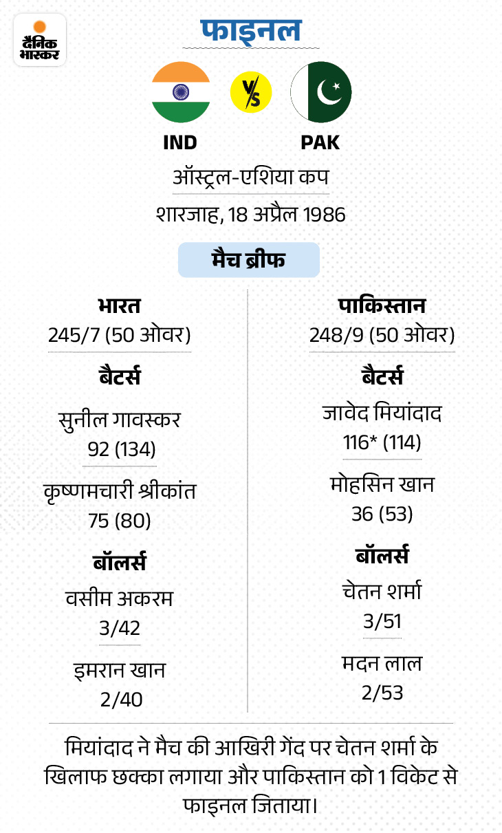 फाइनल-2: मियांदाद का आखिरी गेंद पर विनिंग सिक्स 18 अप्रैल 1986 को शारजाह में भारत और पाकिस्तान के बीच ऑस्ट्रल-एशिया कप का फाइनल खेला गया। भारत ने पहले बैटिंग करते हुए 7 विकेट खोकर 245 रन बनाए। श्रीकांत, गावस्कर और वेंगसरकर ने फिफ्टी लगाई। पाकिस्तान ने 49.5 ओवर तक 9 विकेट खोकर 242 रन बना लिए।