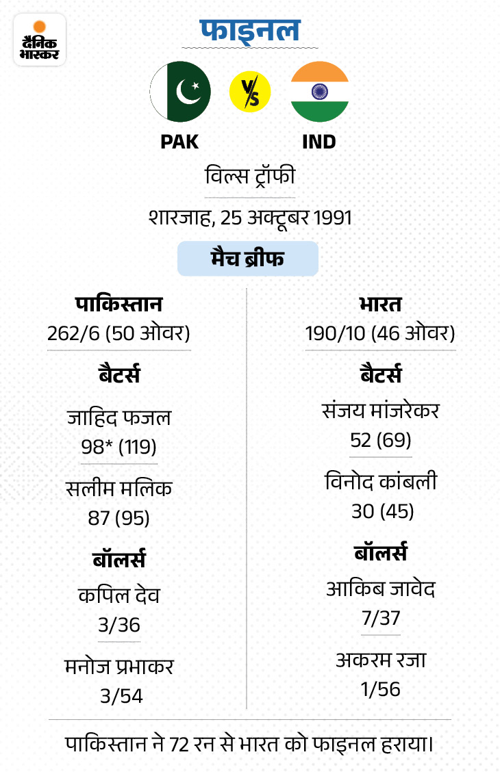 फाइनल-3: विल्स ट्रॉफी में आकिब जावेद को 7 विकेट 25 अक्टूबर 1991 को विल्स ट्रॉफी के फाइनल में दोनों टीमें भिड़ीं। पाकिस्तान ने पहले बैटिंग करते हुए 6 विकेट के नुकसान पर 262 रन बना दिए। जाहिद फजल ने 98 और सलीम मलिक ने 87 रन बनाए। जवाब में टीम इंडिया 190 रन बनाकर सिमट गई। पाकिस्तान से तेज गेंदबाज आकिब जावेद ने महज 37 रन देकर 7 विकेट लिए।