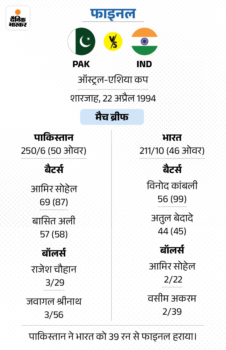 फाइनल-4: ऑस्ट्रल-एशिया कप में चमके आमिर सोहेल 22 अप्रैल 1994 को शारजाह में भारत-पाकिस्तान के बीच ऑस्ट्रल-एशिया कप का फाइनल हुआ। पाकिस्तान ने आमिर सोहेल और बासित अली की फिफ्टी की दम पर 250 रन बना दिए। जवाब में टीम इंडिया 211 रन बनाकर सिमट गई। सोहेल ने बॉलिंग से 2 विकेट भी लिए।