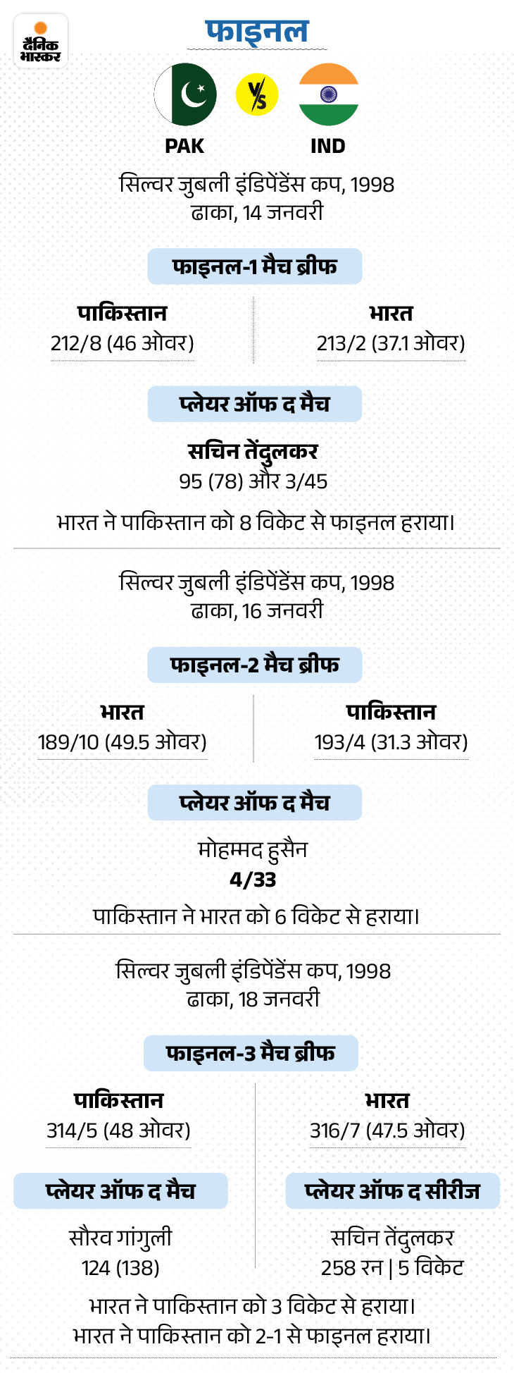 फाइनल-5: ट्राई सीरीज के 3 फाइनल, भारत 2-1 से जीता जनवरी 1998 में भारत, पाकिस्तान और बांग्लादेश के बीच सिल्वर जुबली इंडिपेंडेंस कप ट्राई सीरीज हुई। ग्रुप स्टेज में भारत ने बांग्लादेश को 4 विकेट और पाकिस्तान को 18 रन से हराया। वहीं पाकिस्तान ने बांग्लादेश को 9 विकेट से हराकर फाइनल में जगह बनाई।