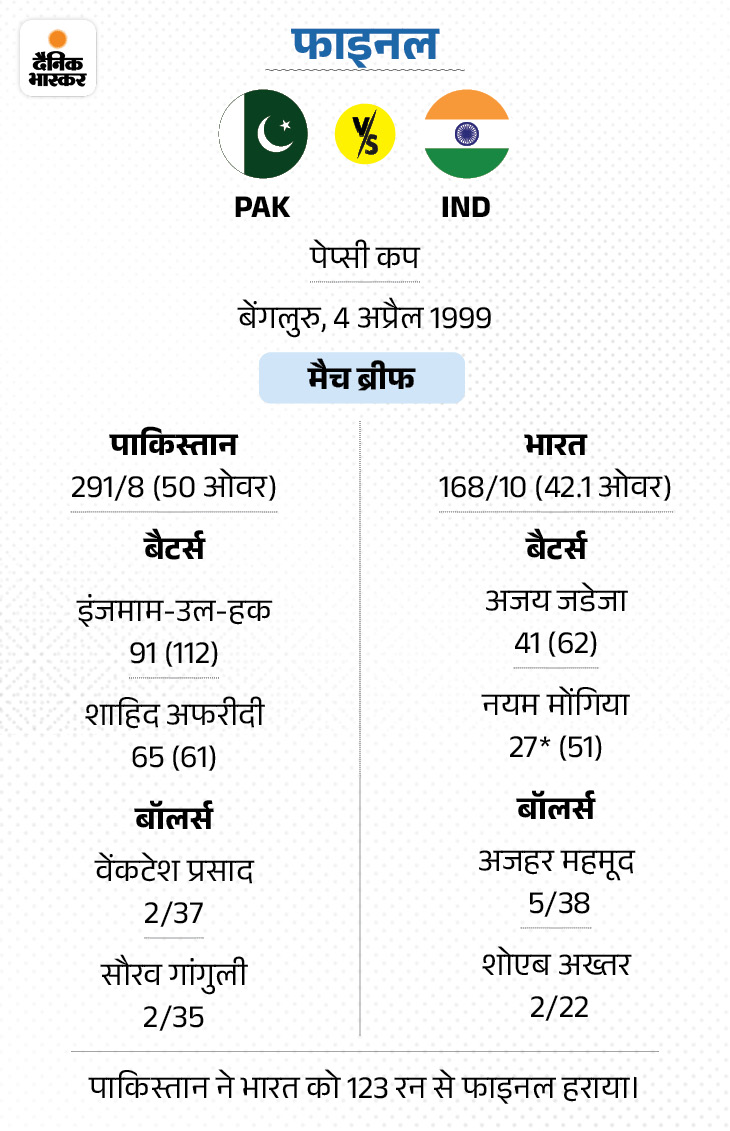 फाइनल-6: पेप्सी कप में अजहर महमूद को 5 विकेट 4 अप्रैल 1999 को बेंगलुरु में दोनों के बीच पेप्सी कप का फाइनल खेला गया। पाकिस्तान ने पहले बैटिंग करते हुए 291 रन बना दिए। जवाब में टीम इंडिया 168 रन बनाकर सिमट गई। पाकिस्तान से तेज गेंदबाज अजहर महमूद ने महज 38 रन देकर 5 विकेट झटक लिए।