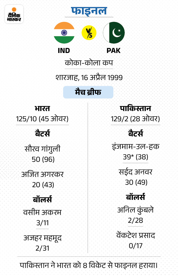 फाइनल-7: कोका-कोला कप में पाकिस्तान जीता 16 अप्रैल 1999 को कोका-कोला कप के फाइनल में दोनों टीमें भिड़ीं। पहले बैटिंग करते हुए टीम इंडिया 125 रन बनाकर ही सिमट गई। पाकिस्तान ने 28 ओवर में महज 2 विकेट खोकर टारगेट हासिल कर लिया। टीम से वसीम अकरम ने महज 11 रन देकर 3 विकेट लिए थे।