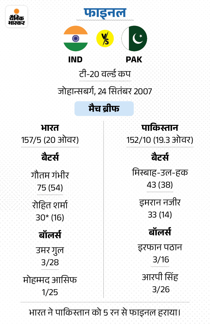 फाइनल-8: भारत ने पहला टी-20 वर्ल्ड कप जीता 24 सितंबर 2007 को जोहान्सबर्ग में दोनों टीमों के बीच पहली बार खेले जा रहे टी-20 वर्ल्ड कप का फाइनल हुआ। भारत ने पहले बैटिंग की। गौतम गंभीर ने 75 रन बनाए और टीम ने 5 विकेट के नुकसान पर 157 रन बना दिए। जवाब में पाकिस्तान 3 गेंद पहले 152 रन पर सिमट गया।