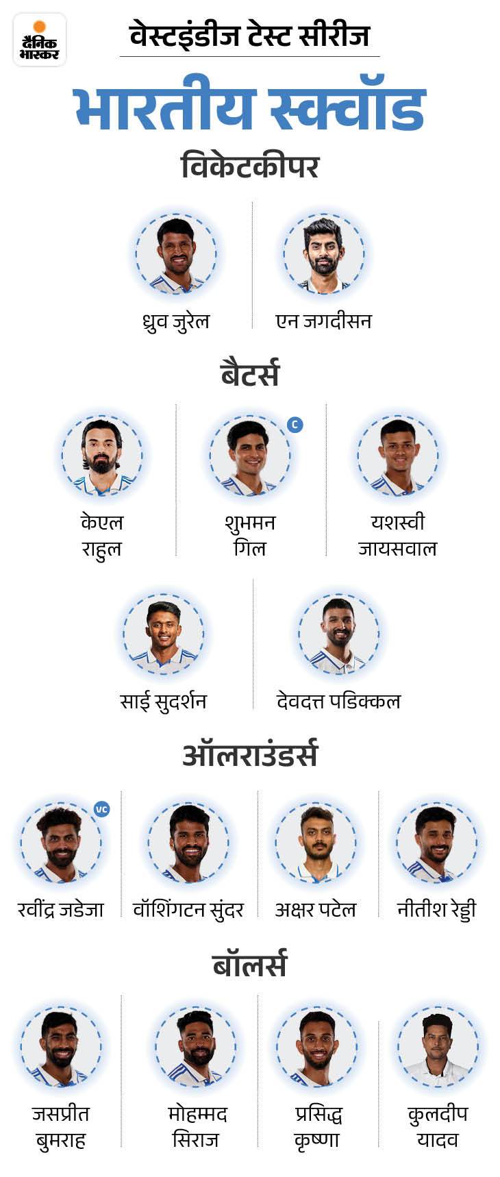 वेस्टइंडीज के खिलाफ 2 मैचों की टेस्ट सीरीज के लिए भारतीय टीम का ऐलान हो गया है। शुभमन गिल की कप्तानी वाली टीम में 15 मेंबर्स को चुना गया है। स्टार ऑलराउंडर रवींद्र जडेजा को उपकप्तान बनाया गया है। रेगुलर उपकप्तान ऋषभ पंत इंग्लैंड दौरे पर चोटिल हो गए थे, वे अभी पूरी तरह फिट नहीं हुए हैं। BCCI ने गुरुवार को दुबई में प्रेस कॉन्फ्रेंस कर टीम का ऐलान किया।