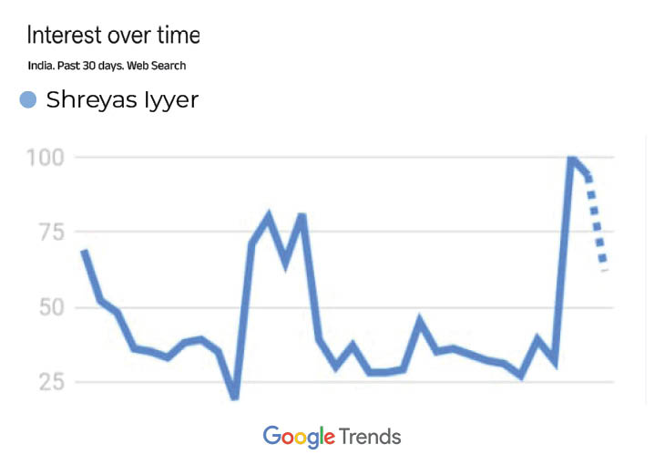 ऑस्ट्रेलिया-ए के खिलाफ 3 मैचों की वनडे सीरीज के लिए इंडिया-ए टीम का ऐलान हो गया है। श्रेयस अय्यर को इंडिया-ए का कप्तान बनाया गया है। इसके बाद लोग लगातार श्रेयस अय्यर के बारे में गूगल पर सर्च कर रहे है। पिछले कुछ दिनों का ग्राफ देखा जाए तो साफ समझ आता है कि उनका ग्राफ तेजी से बढ़ा है। नीचे देखें गूगल ट्रेंड्स…