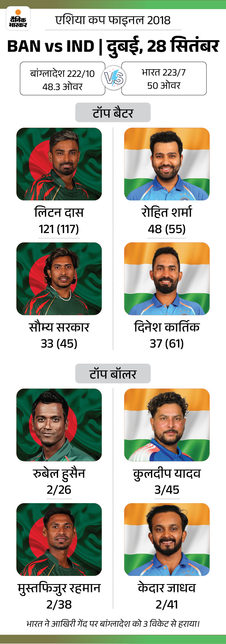 केदार जाधव को इंजरी के कारण रिटायर्ड हर्ट होना पड़ा था। वे 7 विकेट गिरने के बाद बैटिंग करने आए, लेकिन उन्हें रन दौड़ने में बहुत परेशानी हो रही थी। उनके सामने कुलदीप यादव थे। आखिरी ओवर में 6 रन चाहिए थे, टीम ने 5 रन बना लिए। आखिरी गेंद पर 1 रन की जरूरत थी, महमूदुल्लाह ने लेग स्टंप की ओर बॉल फेंकी। जाधव ने लेग साइड की ओर गेंद खेलकर लड़खड़ाते हुए सिंगल लिया और भारत को 3 विकेट से रोमांचक मुकाबला जिता दिया।