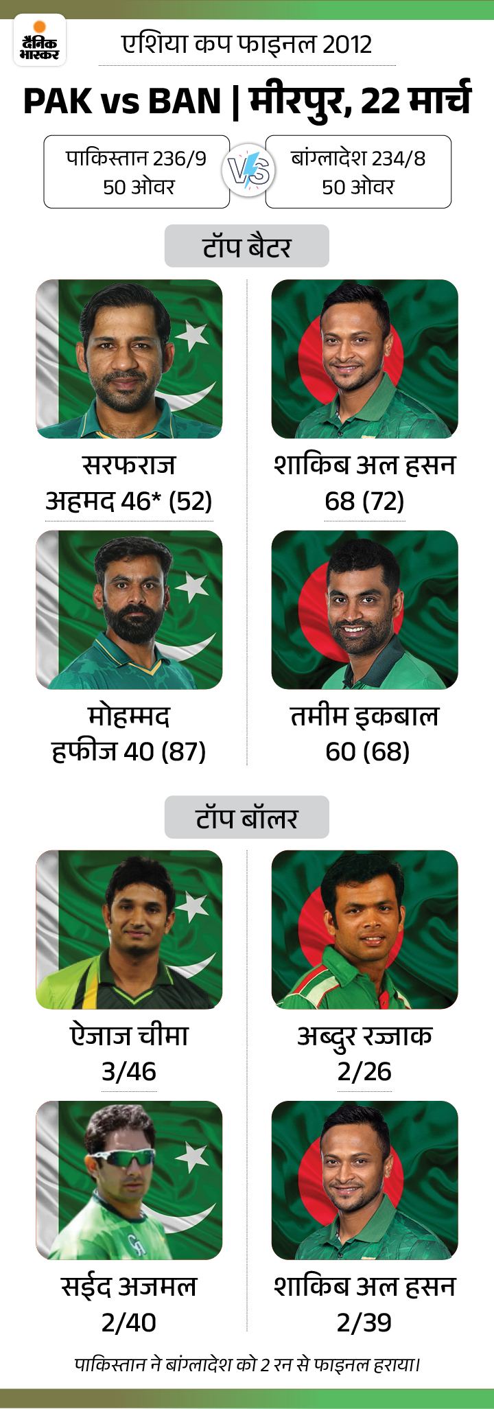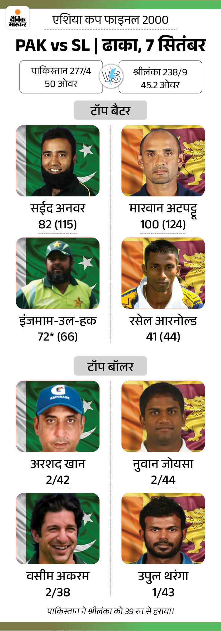 पाकिस्तान ने अब तक 2 ही एशिया कप जीते हैं। 2012 में टीम आखिरी ओवर में 9 रन बचाकर 2 रन के करीबी अंतर से जीत पाई थी। वहीं 2000 के फाइनल में टीम ने श्रीलंका के खिलाफ 277 रन बना दिए। जवाब में श्रीलंका से मारवान अटपट्टू ने सेंचुरी जरूर लगाई, लेकिन टीम 238 रन ही बना सकी। पाकिस्तान ने 39 रन के अंतर से मुकाबला जीत लिया।