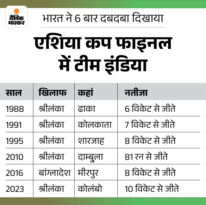 भारत ने अब तक 8 बार एशिया कप की ट्रॉफी अपने नाम की। 2018 में मुकाबला आखिरी गेंद तक चला। वहीं 1984 में पॉइंट्स टेबल के आधार पर ट्रॉफी मिली। इनके अलावा टीम ने जो 6 खिताब जीते, उनमें फाइनल में एकतरफा दबदबा बनाया। 2023 में पिछला फाइनल तो कुछ ज्यादा ही भारत के पक्ष में चले गया।