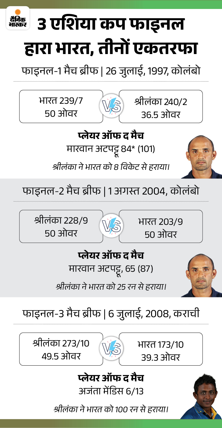 भारत ने एशिया कप के 10 फाइनल खेले। 6 बार टीम ने एकतरफा जीत हासिल, एक मुकाबला आखिरी गेंद तक चला। वहीं 3 बार टीम को एकतरफा हार भी मिली। तीनों बार श्रीलंका ने बाजी मारी। 1997 में श्रीलंका 37वें ओवर में ही 8 विकेट के अंतर से जीत गया। 2004 में श्रीलंका ने 25 रन से हराया, वहीं 2008 टीम को 100 रन के बड़े अंतर से हार मिली।