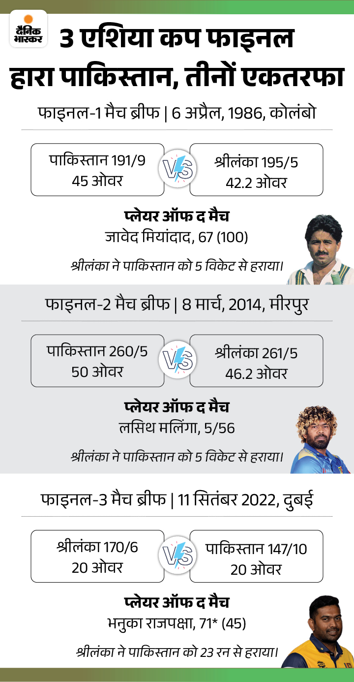 पाकिस्तान ने एशिया कप के 5 फाइनल खेले। टीम 1 बार करीबी अंतर से जीती, वहीं 1 बार एकतरफा अंदाज में जीत हासिल की। हालांकि, 3 बार टीम को श्रीलंका ने एकतरफा फाइनल हरा दिया। 1986 में श्रीलंका 42.2 ओवर में 5 विकेट खोकर ही जीत गया। 2014 में पाकिस्तान टीम 46.2 ओवर में 5 विकेट से हारी। वहीं 2022 के टी-20 फाइनल में टीम को 23 रन की हार मिली। 170 के जवाब में टीम 147 रन तक ही पहुंच सकी।