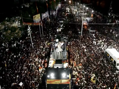 आयोजक विजय की 60 फीट लंबी प्रचार बस को 100 फीट चौड़ी भीड़ भरी सड़क पर ले गए। रैली में दूर-दूर तक लोगों की भीड़ नजर आ रही थी।