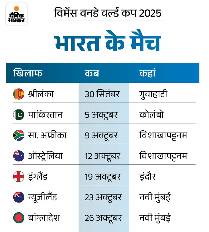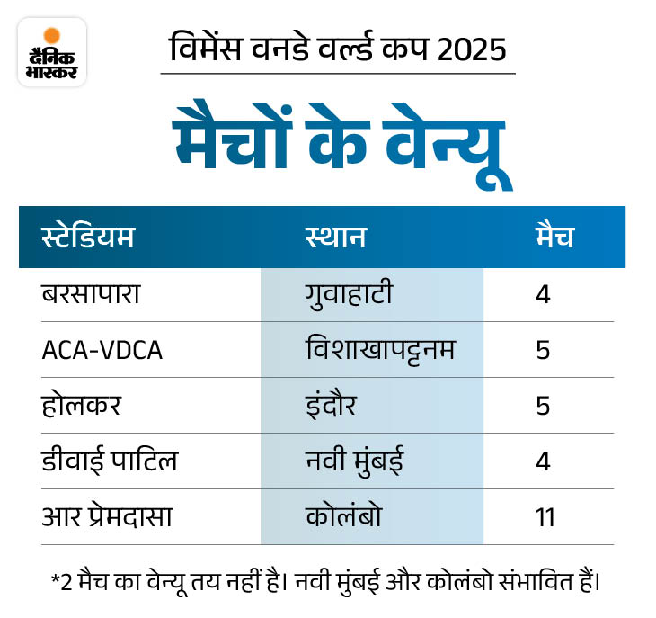किन वेन्यू पर मुकाबले होंगे? भारत में 4 वेन्यू पर मैच होंगे। गुवाहाटी, इंदौर, विशाखापट्टनम और नवी मुंबई को मेजबानी मिली है। श्रीलंका के कोलंबो में पाकिस्तान के सभी मैच खेले जाएंगे। अगर पाकिस्तान ने खिताबी मुकाबले तक एंट्री की तो एक सेमीफाइनल और फाइनल मैच कोलंबो में ही खेला जाएगा। अगर पाकिस्तान नॉकआउट राउंड में एंट्री नहीं कर सका तो मैच नवी मुंबई में होंगे।