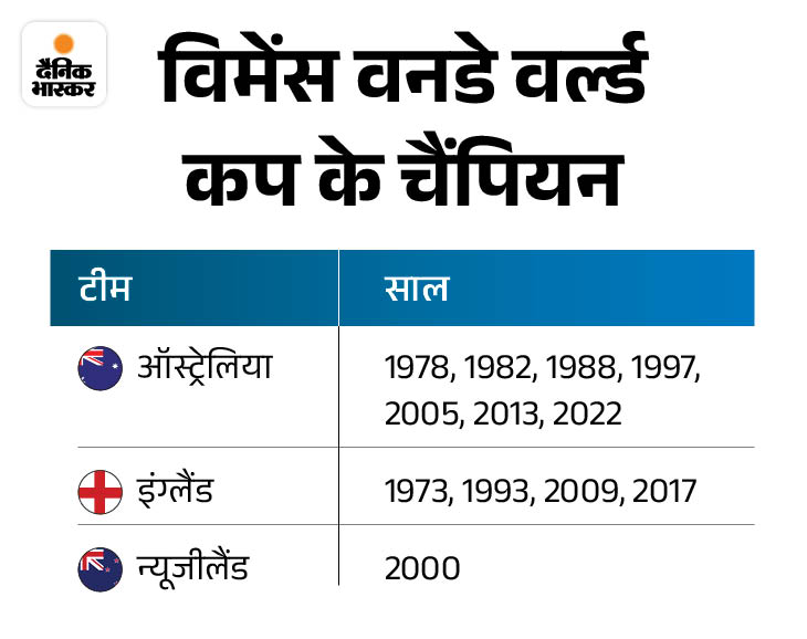 कौन सी टीम खिताब की दावेदार है? 7 बार की चैंपियन ऑस्ट्रेलिया फिर एक बार टाइटल जीतने की सबसे बड़ी दावेदार है। टीम डिफेंडिंग चैंपियन भी है। ऑस्ट्रेलिया को हराने वाली टीम के पास भी खिताब जीतने का सबसे बड़ा मौका रहेगा। इंग्लैंड और इंडिया विमेंस ने पिछले कुछ सालों में ऑस्ट्रेलिया के सामने फाइट दिखाई है। ऐसे में ये तीनों टीमें टाइटल की रेस में आगे हैं।