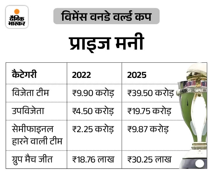 टूर्नामेंट की प्राइज मनी क्या है? इंटरनेशनल क्रिकेट काउंसिल (ICC) ने विमेंस वनडे वर्ल्ड कप की प्राइज मनी को पिछली बार से 4 गुना तक बढ़ा दिया है। टूर्नामेंट में टीमों के बीच 13.88 मिलियन डॉलर (करीब 122 करोड़ रुपए) बांटे जाएंगे। यह प्राइज मनी मेंस वर्ल्ड कप से 39 करोड़ रुपए ज्यादा है।