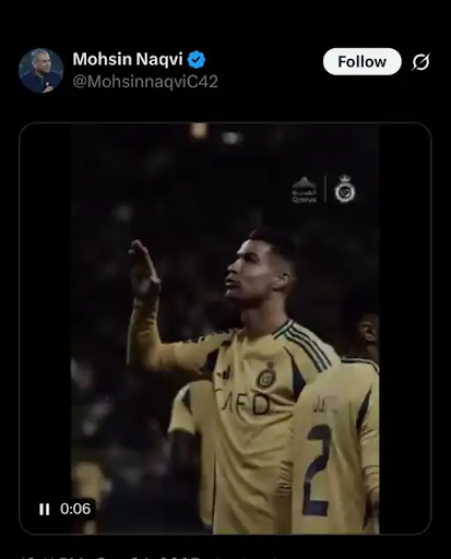 PCB चीफ ने भी विवादित पोस्ट की थी नकवी ने पिछले दिनों एक्स पर विमान क्रैश होने का संकेत देते हुए क्रिस्टियानो रोनाल्डो के गोल का जश्न मनाते हुए वीडियो डाला था। इसमें फुटबॉलर क्रिस्टियानो रोनाल्डो एक विमान के क्रैश होने का इशारा करते दिख रहे हैं, जो रऊफ के मैदान पर किए गए इशारे से मिलता-जुलता है।