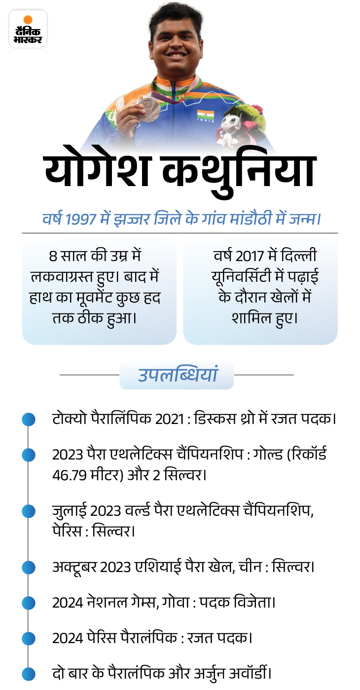 झज्जर जिले के बहादुरगढ़ के गांव मांडौठी से देश के जाने-माने पैरा एथलीट योगेश कथुनिया ने दिल्ली में चल रही विश्व पैरा एथलेटिक्स चैंपियनशिप में रजत पदक हासिल किया। लगातार अंतरराष्ट्रीय मुकाबलों में पदक जीतने वाले योगेश का लक्ष्य हमेशा स्वर्ण पदक रहा है,