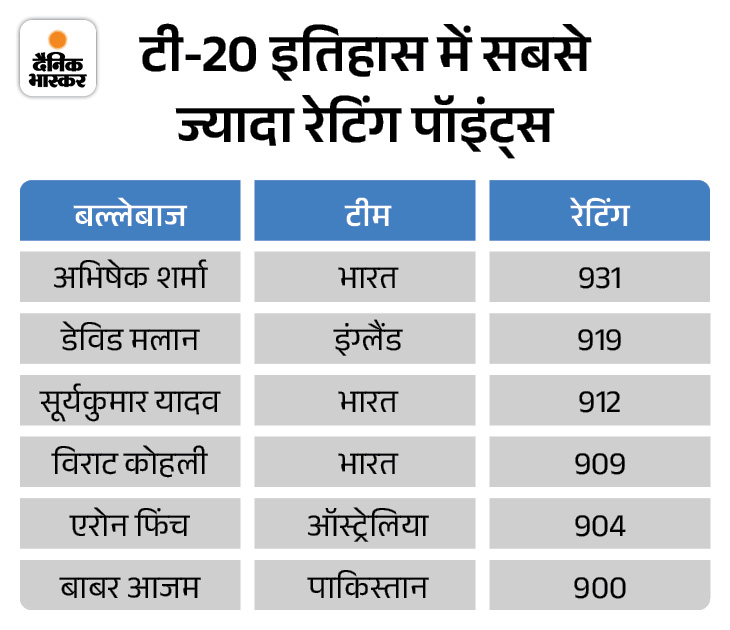 एशिया कप में श्रीलंका के खिलाफ मैच के बाद अभिषेक के 931 रेटिंग पॉइंट्स हो गए थे। यह टी-20 क्रिकेट में किसी भी बल्लेबाज के रेटिंग पॉइंट्स का अब तक का सबसे बड़ा नंबर है। पिछला रिकॉर्ड मलान के नाम था। मलान ने 2020 में 919 पॉइंट्स हासिल किए थे।