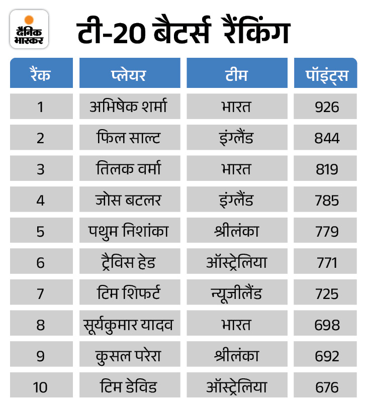 इंग्लैंड के फिल साल्ट दूसरे और जोस बटलर चौथे स्थान पर हैं। एशिया कप में भारत के खिलाफ सेंचुरी जमाने वाले श्रीलंका के पथुम निशांका पांचवें नंबर पर हैं।