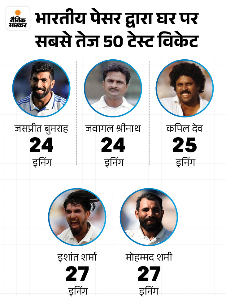 घरेलू मैदानों पर बुमराह के 50 विकेट पूरे घर में सबसे तेजी से 50 टेस्ट विकेट लेने वाले भारतीय तेज गेंदबाजों की सूची में जसप्रीत बुमराह ने जवागल श्रीनाथ की बराबरी की। दोनों 24-24 पारियों के साथ संयुक्त रूप से पहले स्थान पर हैं। उनके बाद, कपिल देव का स्थान आता है, जिन्होंने 25 पारियों में 50 विकेट पूरे किए थे। इस सूची में, इशांत शर्मा और मोहम्मद शमी दोनों 27-27 पारियों के साथ संयुक्त रूप से चौथे स्थान पर हैं।