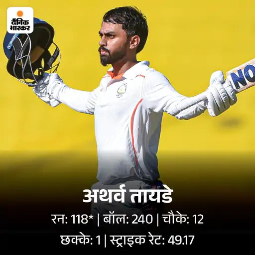 शतकवीर तायडे 15 रन बनाकर आउट दूसरी पारी में विदर्भ ने 2 विकेट खोकर 96 रन बना लिए। टीम से पहली पारी में सेंचुरी लगाने वाले अथर्व तायडे 15 ही रन बनाकर आउट हो गए। उनके बाद अमन मोखाडे 37 रन बनाकर पवेलियन लौटे। ध्रुव शोरे 24 और दानिश मालेवार 16 रन बनाकर नॉटआउट लौटे।