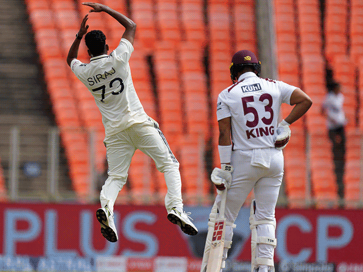 मोहम्मद सिराज का रोनाल्डो सेलिब्रेशन:बुमराह की दो यॉर्कर पर दो बोल्ड; जुरेल का लेग-साइड डाइविंग कैच, IND Vs WI मोमेंट्स
