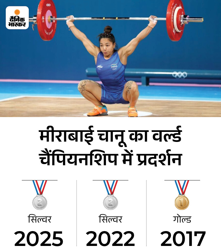 स्नैच में वह 87kg के दो प्रयासों में असफल रहीं। क्लीन एंड जर्क में उन्होंने शानदार वापसी की और अपने तीनों प्रयास (109 किग्रा, 112 किग्रा और 115 किग्रा) आसानी से पूरे किए। खास बात यह है कि मीराबाई ने आखिरी बार 115kg का वजन 2021 टोक्यो ओलिंपिक में उठाया था, जहां उन्होंने सिल्वर मेडल जीता था।