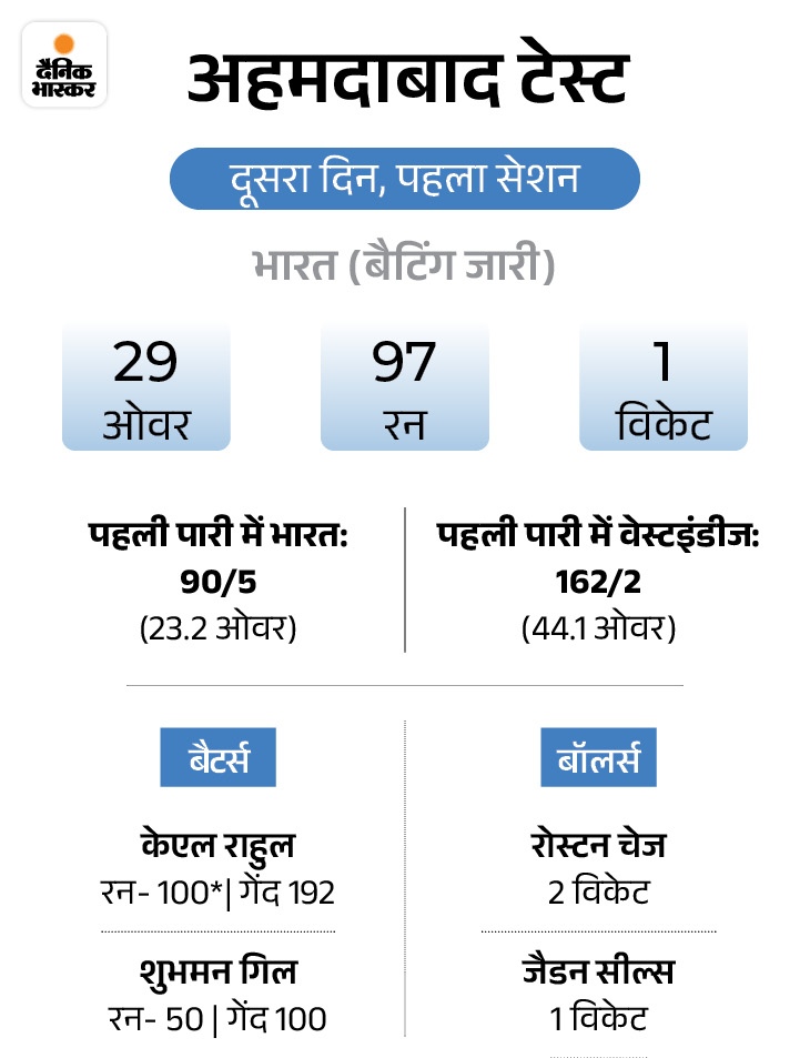 हाफ सेंचुरी बनाकर आउट हुए कप्तान गिल भारतीय टीम ने दूसरे दिन 121/2 के स्कोर से आगे खेलना शुरू किया। कप्तान शुभमन गिल ने पहले दिन के अपने स्कोर में 32 रन और जोड़े। वे पूरे 50 रन बनाकर रोस्टन चेज की गेंद पर जस्टिन ग्रीव्स को कैच थमा बैठे। गिल ने 48 गेंदों का सामना किया और 4 चौके जमाए। गिल और केएल राहुल ने तीसरे विकेट की साझेदारी में 98 रन जोड़े।