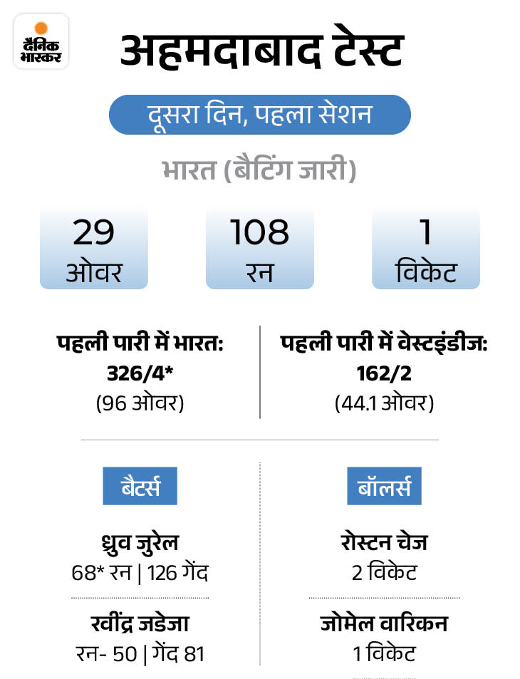 भारतीय टीम ने अहमदाबाद टेस्ट में वेस्टइंडीज के खिलाफ पहली पारी में 100 ओवर बैटिंग कर ली है। टीम ने 4 विकेट पर 335 रन बनाए। विकेटकीपर ध्रुव जुरेल और रवींद्र जडेजा की जोड़ी नाबाद है।