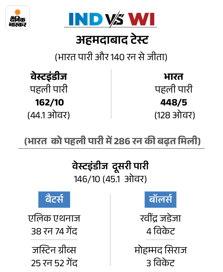 भारत ने दो टेस्ट मैचों की सीरीज के पहले मुकाबले में वेस्टइंडीज को पारी और 140 रन से हरा दिया है। यह मुकाबला तीसरे दिन टी-ब्रेक से पहले ही खत्म हो गया। एक टेस्ट मैच में 450 ओवर का खेल मुमकिन होता है, लेकिन अहमदाबाद में खेला गया पहला टेस्ट 217.2 ओवर में ही समाप्त हो गया।