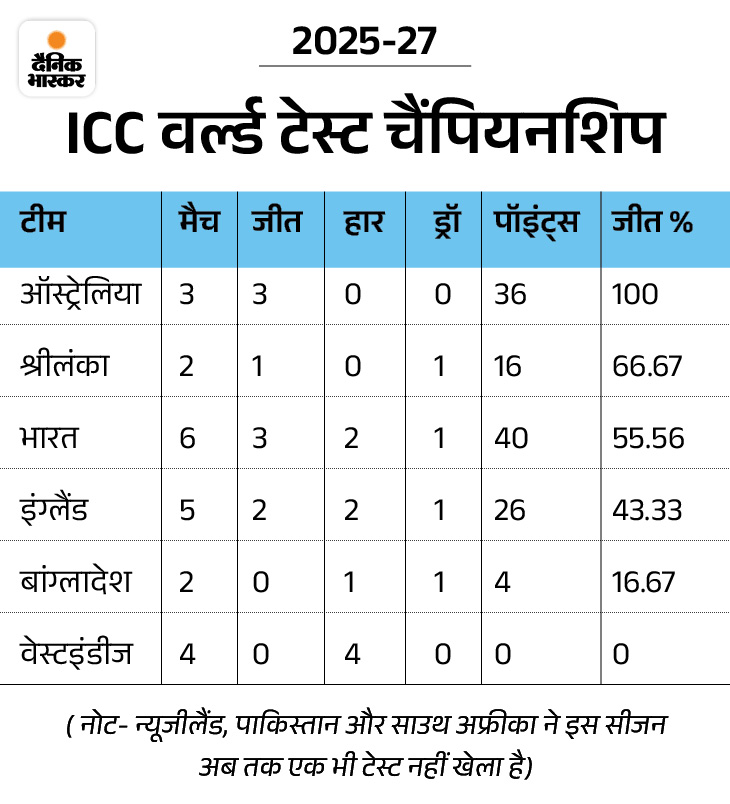 WTC पॉइंट्स टेबल में भारत तीसरे स्थान पर…